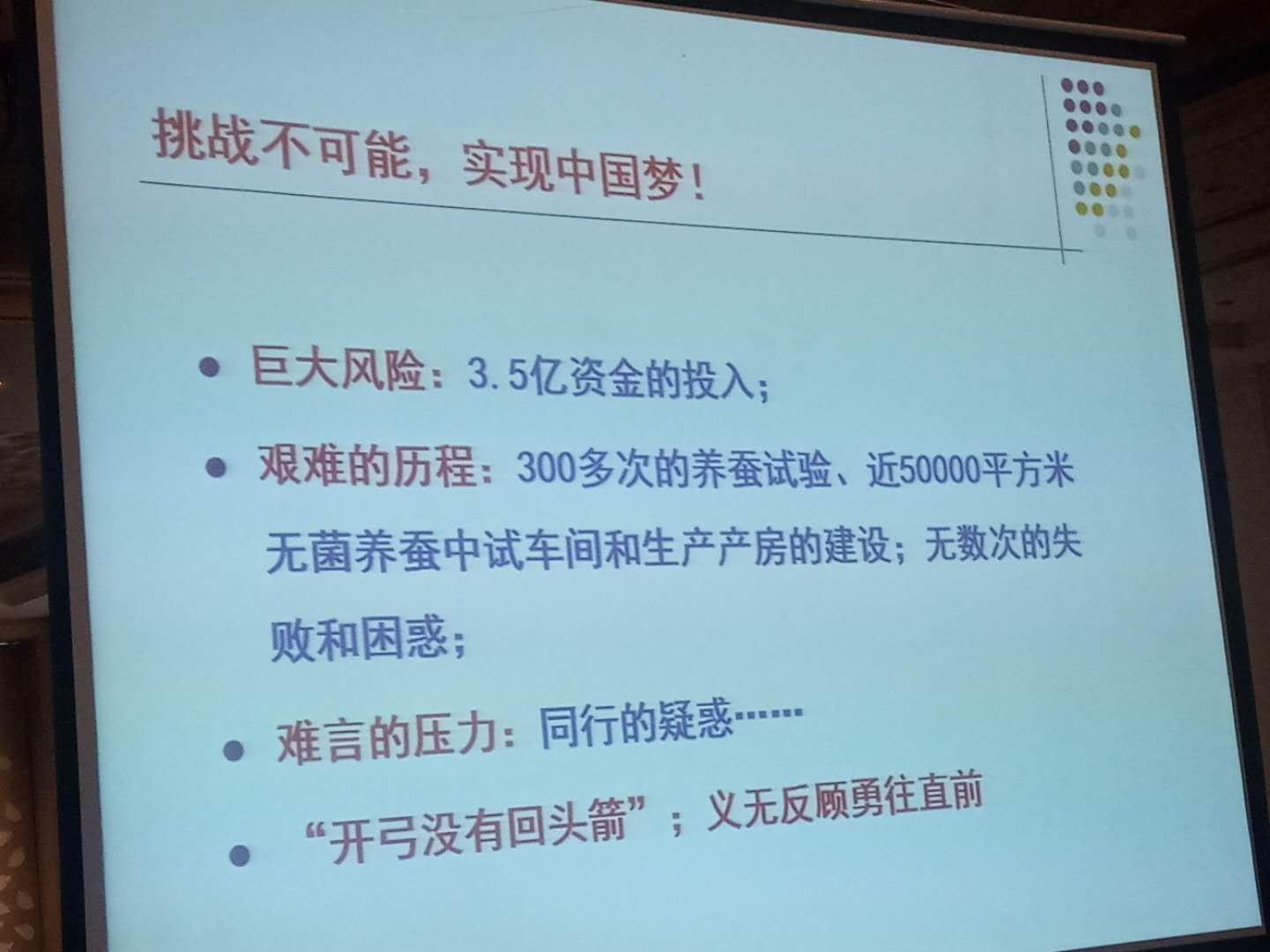 原浙江省農(nóng)業(yè)科學(xué)院副院長孟智啟研究員作了人工飼料工廠化養(yǎng)蠶專題報(bào)告,報(bào)告分析了:一、半個(gè)世紀(jì)來蠶絲主要生產(chǎn)區(qū)域的遷移;二、現(xiàn)代農(nóng)業(yè)發(fā)展的三大特征;三、現(xiàn)代農(nóng)業(yè)發(fā)展背景下集約化養(yǎng)蠶概念的提出和實(shí)踐。經(jīng)過七年的艱難創(chuàng)業(yè),克服了一個(gè)個(gè)技術(shù)瓶頸,挑戰(zhàn)了不可能,實(shí)現(xiàn)了“人工飼料工廠化養(yǎng)蠶”的中國夢。人工飼料工廠化養(yǎng)蠶創(chuàng)建了全年連續(xù)養(yǎng)蠶新模式,拓展了蠶學(xué)學(xué)科新的研究方向和新的學(xué)科領(lǐng)域,搭建了科技創(chuàng)新的產(chǎn)學(xué)研新平臺(tái)。