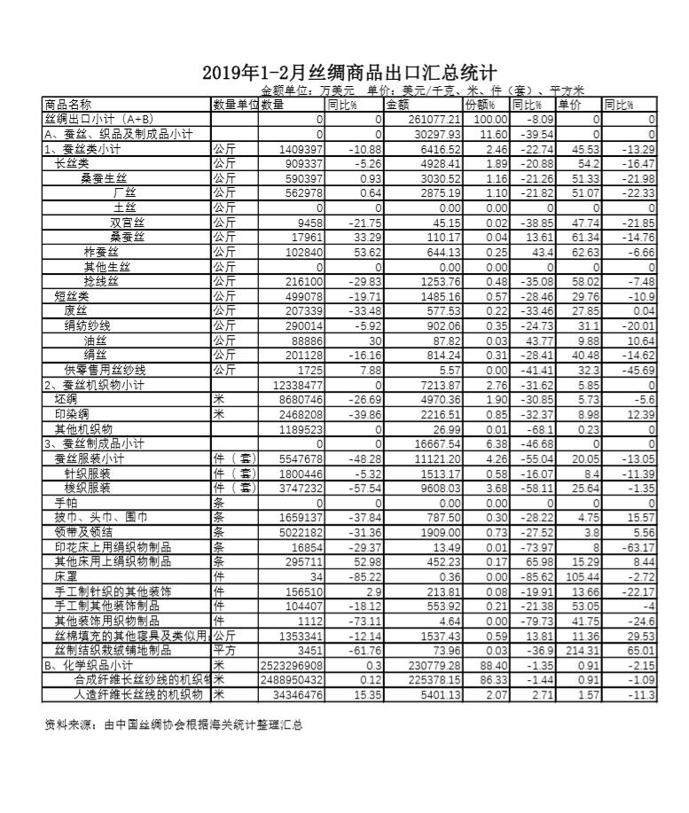 2019年1-2月份絲綢商品出口匯總統(tǒng)計(jì)