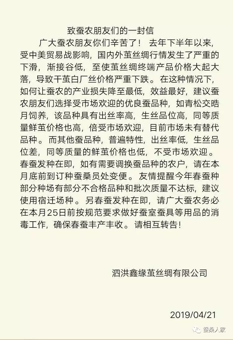 企業(yè)也在提高產(chǎn)銷的靈活性和針對性以適應形勢變化。我們看下江蘇泗洪鑫緣繭絲綢有限公司致蠶農(nóng)的一封信: