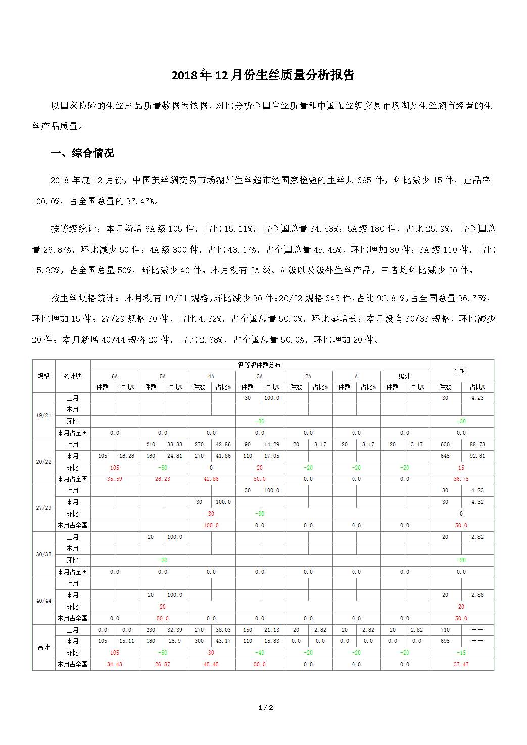 2018年12月份生絲質(zhì)量分析報(bào)告