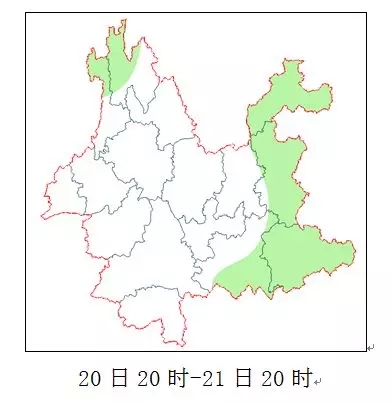 20日20時(shí)-21日20時(shí):昭通、曲靖、文山、紅河南部、迪慶西部、怒江北部陰天間多云有陣雨,其它地區(qū)晴間多云。
