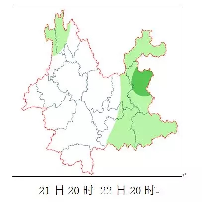 21日20時(shí)-22日20時(shí):昭通、曲靖、文山、昆明東部、玉溪東部、紅河?xùn)|部、迪慶西部、怒江北部陰天間多云有陣雨局部中雨,其它地區(qū)晴間多云。