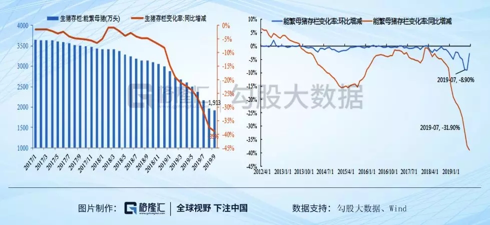 2018年全國(guó)豬肉消費(fèi)量在5600萬(wàn)噸,按歷史數(shù)據(jù),全球豬肉產(chǎn)量1.2億噸,中國(guó)5500萬(wàn)噸,歐盟不到2400萬(wàn)噸,加拿大每年200多萬(wàn)噸,占比不到2%,豬肉進(jìn)口量今年能有200萬(wàn)噸就很不錯(cuò)了,產(chǎn)能缺口很難補(bǔ)上,現(xiàn)階段還是主要靠國(guó)內(nèi)自身產(chǎn)能調(diào)控。再看供給方面,原本按正常養(yǎng)殖技術(shù)的進(jìn)步,能繁母豬存量每年下降200萬(wàn)頭是很正常的水平,但從2018年開(kāi)始,能繁母豬存欄量直接開(kāi)始斷崖式下跌,1年多跌掉了1400萬(wàn)頭,數(shù)量創(chuàng)12年以來(lái)新底,從下面這張圖感受一下這個(gè)同比下降的速度到底有多快。