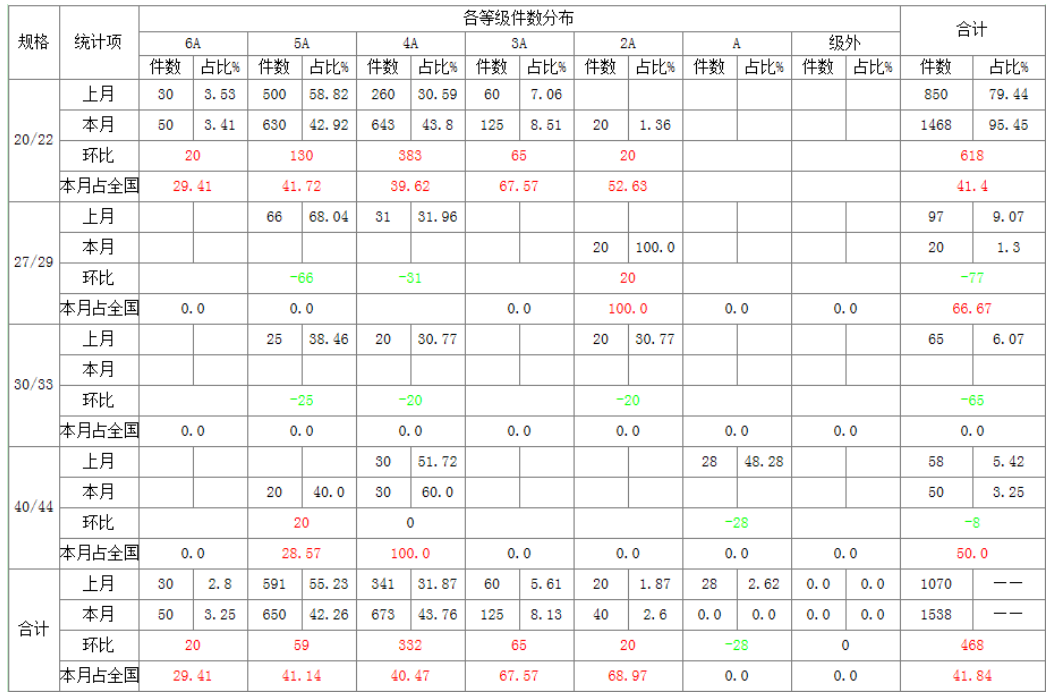 按生絲規(guī)格統(tǒng)計(jì): 20/22 規(guī)格 1468 件,占比 95.45%,占全國總量 41.4%,環(huán)比增加 618 件;27/29 規(guī)格 20 件,占比 1.3%,占全國總量 66.67%,環(huán)比減少 77 件;30/33 規(guī)格本月沒有,環(huán)比減少 65 件;40/44 規(guī)格 50 件,占比3.25%,占全國總量 50.0%,環(huán)比減少 8 件。