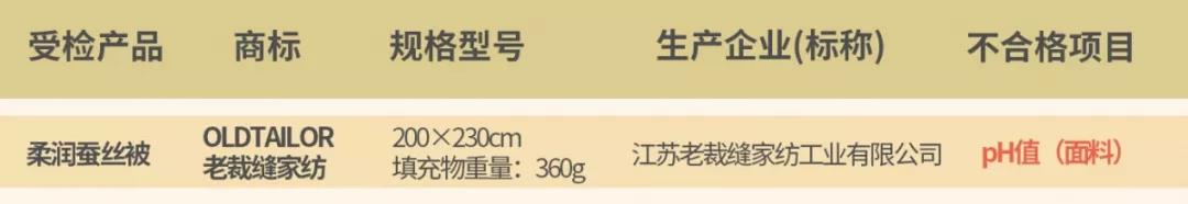 健康皮膚的pH值在5.6~5.6之間,蠶絲被的pH值過(guò)高或過(guò)低,均有可能破壞人體皮膚酸堿度平衡,引發(fā)皮膚過(guò)敏或感染。本次抽檢的產(chǎn)品“OLDTAILOR老裁縫家紡”柔潤(rùn)蠶絲被的pH值不符合標(biāo)準(zhǔn)要求。