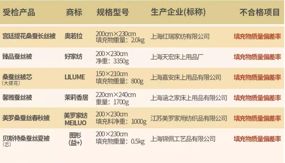 本次抽查中,有6批填充物質(zhì)量偏差率不符合國(guó)家標(biāo)準(zhǔn)要求,不合格樣品中,最大的偏差為-40.7%,有短斤缺兩欺騙消費(fèi)者嫌疑。包括:“奧若拉”宮廷提花桑蠶長(zhǎng)絲被、“好家紡”臻品蠶絲被、“LILUME”桑蠶絲被芯(大提花)、“茉莉香居”馨雅蠶絲被、“美羅家紡 MEILUO”美羅桑蠶絲春秋被、“圖形(益+)”貝斯特桑蠶絲夏被(芯)。