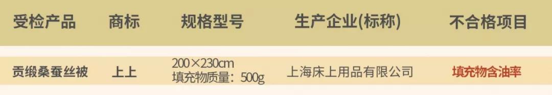 此外,含油率也是蠶絲被內(nèi)在質(zhì)量考核指標(biāo),如果含油率過(guò)高,絲綿容易變質(zhì)而產(chǎn)生異味、變硬的情況,此次抽檢“上上”貢緞桑蠶絲被含油率達(dá)不到標(biāo)準(zhǔn)要求。
