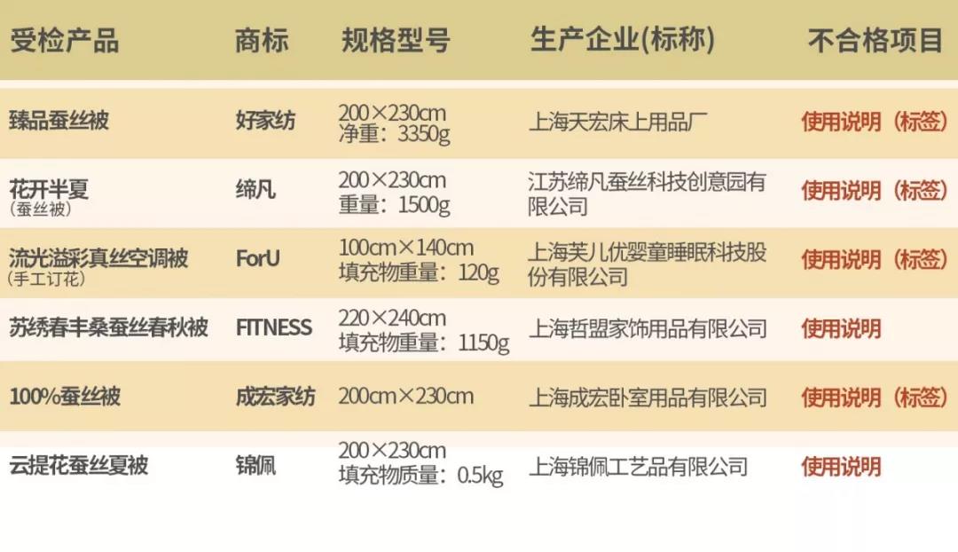 而這次抽查中,有6批產(chǎn)品的標(biāo)簽存在信息不全,沒(méi)有按照國(guó)家標(biāo)準(zhǔn)規(guī)定標(biāo)注的情況。包括:“好家紡”臻品蠶絲被、“締凡”花開(kāi)半夏(蠶絲被)、“ForU”流光溢彩真絲空調(diào)被(手工訂花)、“FITNESS”蘇繡春豐桑蠶絲春秋被、“成宏家紡”100%蠶絲被、“錦佩”云提花蠶絲夏被。