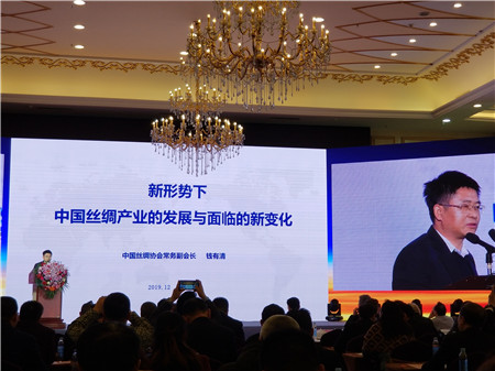 中國絲綢協(xié)會副會長錢有清做了關于新形勢下中國絲綢產業(yè)的發(fā)展與面臨的新變化的報告,首先錢會長明確了絲綢產業(yè)的定位是中國文化國粹產業(yè);精準扶貧、鄉(xiāng)村振興產業(yè);生態(tài)環(huán)保、綠色健康產業(yè);國際競爭優(yōu)勢產業(yè),并介紹了近幾年中國繭絲綢行業(yè)的發(fā)展情況,包括產業(yè)結構持續(xù)優(yōu)化升級、研發(fā)制造能力加速提升、創(chuàng)新體系建設更加完善、行業(yè)綠色發(fā)展有序推進。