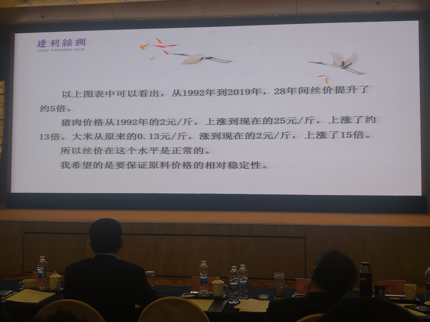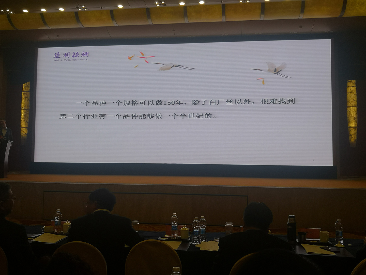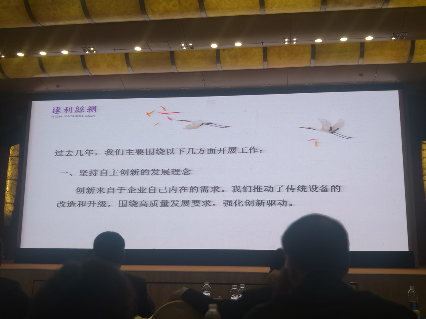 林董認(rèn)為在即將過去的2019年,絲綢行業(yè)有三個(gè)歷史性的重大事件:巴貝工廠化養(yǎng)蠶取得圓滿成功,中國(guó)制造的數(shù)碼雙面印花設(shè)備和技術(shù)驚艷全球絲綢行業(yè),浙江理工大學(xué)陳文興校長(zhǎng)被評(píng)為中國(guó)工程院院士。他介紹了達(dá)利發(fā)展情況和開展自主創(chuàng)新、智能制造、5G技術(shù)應(yīng)用、綠色制造等方面展開工作。制造品牌和消費(fèi)品牌是兩個(gè)不同概念,中國(guó)已經(jīng)從絲綢大國(guó)轉(zhuǎn)變?yōu)榻z綢強(qiáng)國(guó)。只要經(jīng)過新舊動(dòng)能轉(zhuǎn)換,傳統(tǒng)絲綢行業(yè)會(huì)成為永遠(yuǎn)的時(shí)尚產(chǎn)業(yè)。林董認(rèn)為絲價(jià)在這個(gè)水平是正常的,希望保持絲價(jià)的相對(duì)穩(wěn)定性。