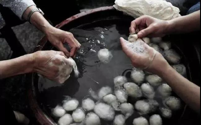 每天凌晨4點,天還沒亮,俞彩根和丈夫俞德龍就早早地忙活開了。起床后的第一件事,就是燒開那一大缸子堿水。一個半小時后,再將前一晚裝好的繭子放入,大約經(jīng)過1小時40分鐘,繭子煮透后,還要再悶上2個小時。起鍋后用清水漂洗,再浸上一夜,等待第二天制作。