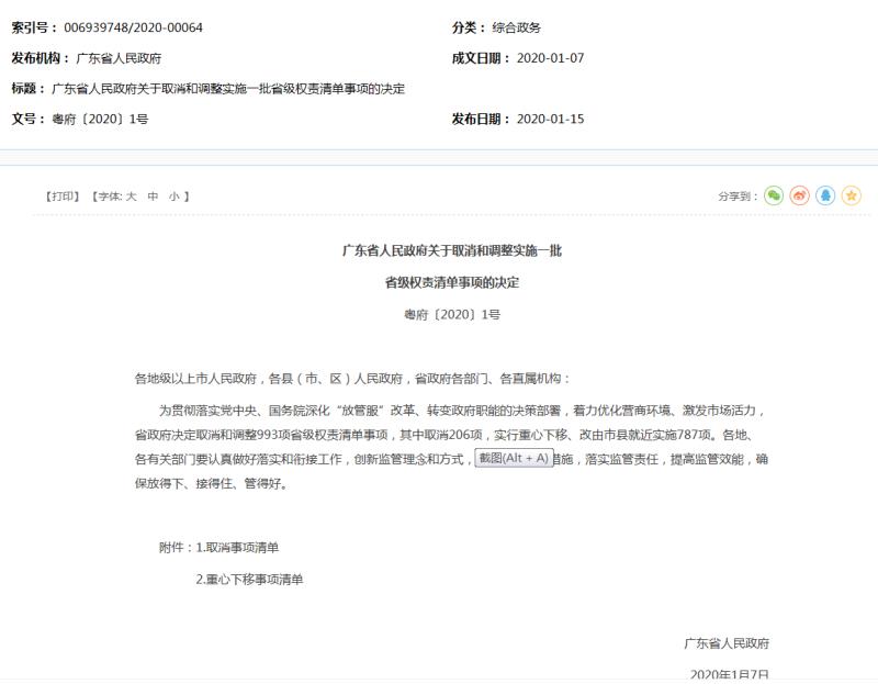 《廣東省人民政府關(guān)于取消和調(diào)整實施一批省級權(quán)責(zé)清單事項的決定》(粵府〔2020〕1號)
