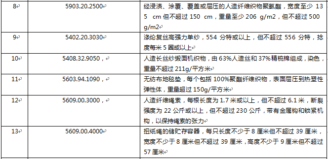 本次修訂的紡織品描述與HS碼如下,出口企業(yè)需重新審查是否符合排除條件:
