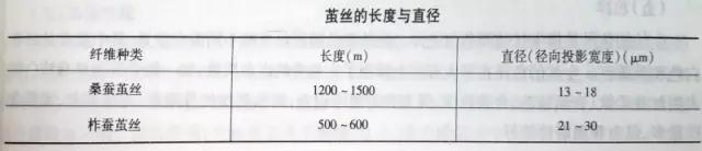桑蠶和柞蠶的繭絲長度和直徑的變化范圍(內(nèi)含兩個(gè)絲素纖維)見下表: