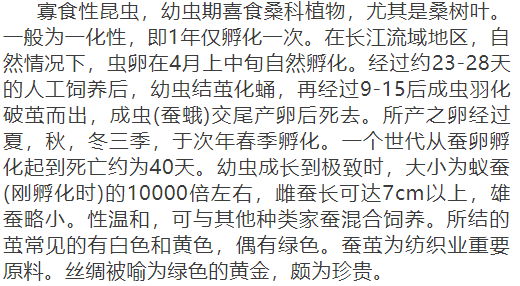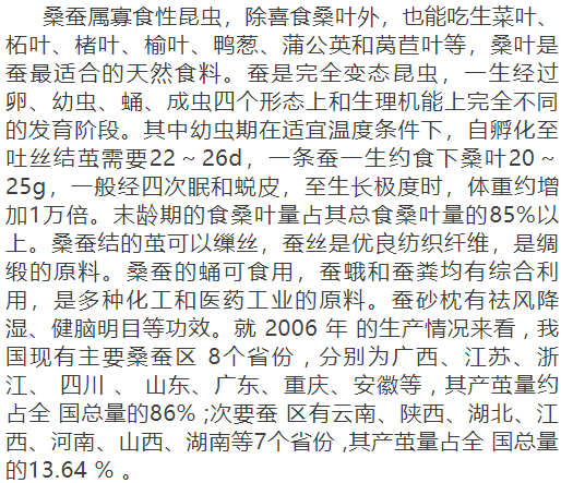 桑蠶起源于中國(guó),它發(fā)育溫度是7~40℃,飼育適溫為20~25℃,主要分布在溫帶、亞熱帶和熱帶地區(qū)。