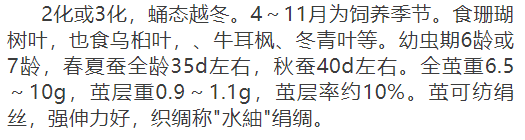 兼食烏桕、蓖麻、冬青、含笑、泡桐、梧桐、樟樹葉等,又名椿蠶、小烏桕蠶。分布于中國(guó)、日本、印度等國(guó)。中國(guó)分布在山東、江蘇、浙江、江西、四川等省。