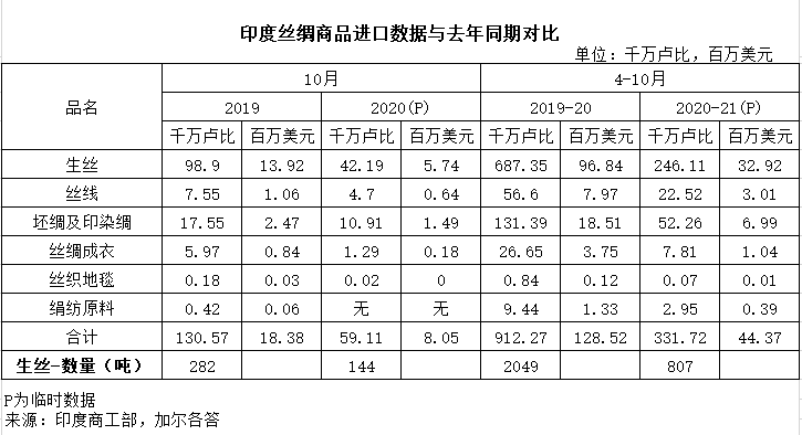 印度絲綢商品2020年10月進(jìn)口數(shù)據(jù)與去年同期對(duì)比