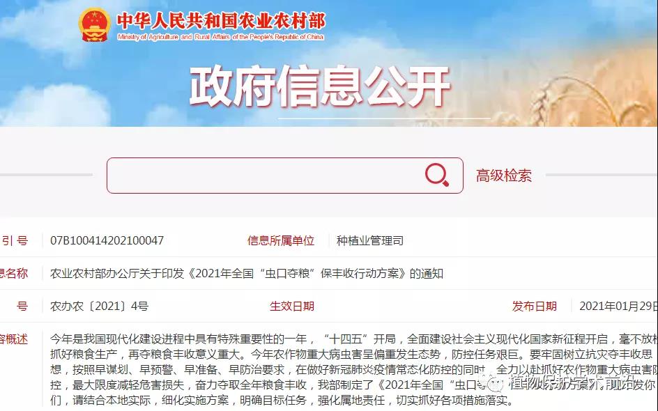 五、保障措施(一)強(qiáng)化責(zé)任落實(shí)。將重大病蟲害防控納入糧食安全黨政同責(zé)考核內(nèi)容,按照《農(nóng)作物病蟲害防治條例》規(guī)定,落實(shí)部門指導(dǎo)、省負(fù)總責(zé)、縣抓落實(shí)責(zé)任機(jī)制,層層壓實(shí)防控責(zé)任,細(xì)化工作措施,及早安排部署,強(qiáng)化督導(dǎo)檢查,確?!跋x口奪糧”保豐收行動順利開展。 (二)強(qiáng)化指導(dǎo)服務(wù)。及時印發(fā)糧食作物重大病蟲害防控方案和指導(dǎo)意見,層層建立分片包干責(zé)任制,防控關(guān)鍵時期組派精干力量深入生產(chǎn)一線,舉辦現(xiàn)場培訓(xùn),面對面、手把手指導(dǎo)農(nóng)民開展防治,確保防控技術(shù)落到實(shí)處。 (三)強(qiáng)化資金支持。根據(jù)糧食作物重大病蟲害發(fā)生和防控需要,農(nóng)業(yè)農(nóng)村部會同財(cái)政部安排農(nóng)業(yè)生產(chǎn)救災(zāi)資金,支持各地開展相關(guān)監(jiān)測和防控工作。各地在管好用好中央財(cái)政資金的同時,增加地方財(cái)政投入,確保監(jiān)測防控措施落實(shí)到位。(四)強(qiáng)化宣傳引導(dǎo)。加強(qiáng)信息報(bào)送,做到對上有信息、對外有聲音、對下有通報(bào)。充分利用電視、廣播、報(bào)刊、網(wǎng)絡(luò)、微信公眾號等宣傳媒體,大力宣傳各地好經(jīng)驗(yàn)、好做法、好典型,為工作推進(jìn)營造良好的輿論氛圍。
