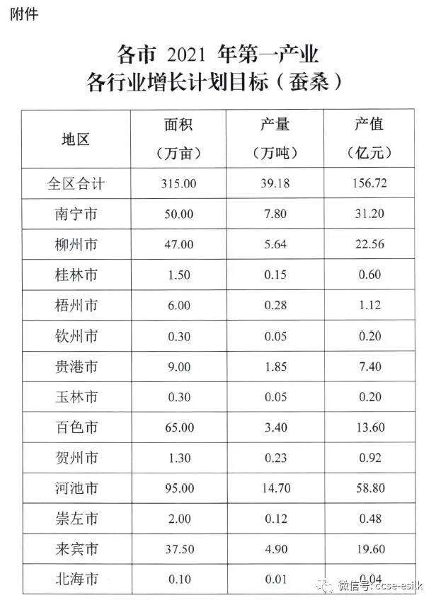 廣西壯族自治區(qū)蠶業(yè)技術(shù)推廣站近日發(fā)出《關(guān)于做好春期蠶桑生產(chǎn)工作的指導(dǎo)意見(jiàn)關(guān)于做好春期蠶桑生產(chǎn)工作的指導(dǎo)意見(jiàn)》。根據(jù)指導(dǎo)意見(jiàn),廣西區(qū)蠶桑產(chǎn)業(yè)2021年發(fā)展目標(biāo)為:桑園面積315萬(wàn)畝、蠶繭產(chǎn)量39.18萬(wàn)噸、蠶繭產(chǎn)量增長(zhǎng)4.06%,并以此將任務(wù)分解下達(dá)到各市。通知要求各地農(nóng)業(yè)農(nóng)村(蠶業(yè))部門要按照下達(dá)的目標(biāo)任務(wù),切實(shí)提高政治站位、強(qiáng)化目標(biāo)導(dǎo)向,采取有效措施,加大扶持力度,強(qiáng)化宣傳引導(dǎo),加強(qiáng)生產(chǎn)指導(dǎo)和技術(shù)培訓(xùn),促進(jìn)桑園面積穩(wěn)定增長(zhǎng)、蠶繭產(chǎn)量質(zhì)量穩(wěn)步提高、蠶農(nóng)增產(chǎn)增收,推進(jìn)蠶桑產(chǎn)業(yè)轉(zhuǎn)型升級(jí)和高質(zhì)量發(fā)展。