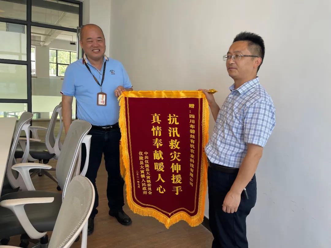 2021年8月2日上午,大寅黨委書記李發(fā)明來到四川布碧絲有機農(nóng)業(yè)科技有限公司,對公司的作為表示衷心的感謝。并將錦旗送上,錦旗上寫到:“抗汛救災(zāi)伸援手,真情奉獻暖人心"。