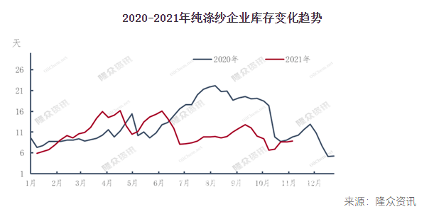 最后看純滌紗庫存情況。2021年純滌紗企業(yè)成品庫存總體低于去年同期水平。年初行情存在一定透支,滌紗企業(yè)庫存普遍偏低,但3、4月的旺季行情沒有等來,外貿(mào)訂單持續(xù)受海運(yùn)輸障礙的阻撓,滌紗企業(yè)庫存也從低位逐步向上攀升。6月以來,擔(dān)憂海運(yùn)輸影響訂單交付,部分外貿(mào)訂單提前下達(dá),純滌紗企業(yè)庫存下滑明顯,但隨后傳統(tǒng)旺季遲遲未至,行業(yè)庫存于8月份再度開始累積。9月中旬以來,受國內(nèi)雙控政策導(dǎo)致的各地紗廠限產(chǎn)影響,局部供需錯(cuò)配也刺激部分下游用戶及貿(mào)易商集中補(bǔ)貨,滌紗庫存再度下滑。即便10月下旬以來部分地區(qū)限電管控力度放松后紗廠開工率有所恢復(fù),但紗廠庫存仍處在偏低水平。