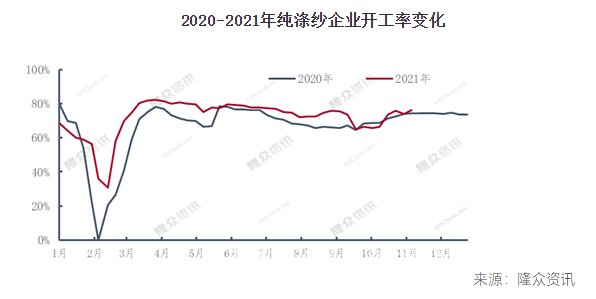 再次看純滌紗開工情況。2021年純滌紗企業(yè)開工率總體高于去年同期。年初,受部分地區(qū)響應(yīng)就地過年的政策影響,年初純滌紗企業(yè)開工率便高于往年同期;并且由于加工費(fèi)空間良好,2-3季度滌紗企業(yè)也均保持較好開工,即便7-8月份受高溫限電影響下行業(yè)開工出現(xiàn)季節(jié)性下滑傾向,但總體下滑幅度不多。而9月以來的雙控影響雖然令滌紗企業(yè)開工率大幅下滑,但下滑幅度也遠(yuǎn)不及滌綸短纖,并且10月中下旬后,主要產(chǎn)銷地的滌紗企業(yè)開工率便陸續(xù)恢復(fù)。截至當(dāng)前,長樂、吳江、蕭紹等地滌紗廠開工率恢復(fù)明顯,南通部分企業(yè)仍有限產(chǎn)情況,河北地區(qū)則主要是受疫情影響導(dǎo)致的臨時(shí)限產(chǎn),但從總體數(shù)值看,目前滌紗開工率要略高于去年同期。