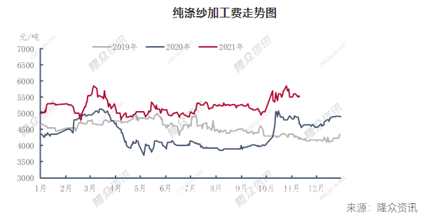 其次看利潤情況,從近幾年純滌紗產(chǎn)品鏈條的利潤結(jié)構(gòu)來看,產(chǎn)業(yè)鏈利潤存在向下游轉(zhuǎn)移的趨勢。近幾年上游原料集中擴(kuò)能,伴隨上游原料國產(chǎn)化、民營化的趨勢,近幾年來聚合成本不斷下滑,而純滌紗經(jīng)過近幾年的產(chǎn)能結(jié)構(gòu)調(diào)整以及自身設(shè)備的升級(jí),自身供需矛盾大幅緩和,行業(yè)盈利水平逐漸上升,尤以2021年更為明顯。2021年1-10月,純滌紗加工費(fèi)平均在5202元/噸,同比上升21.25%。