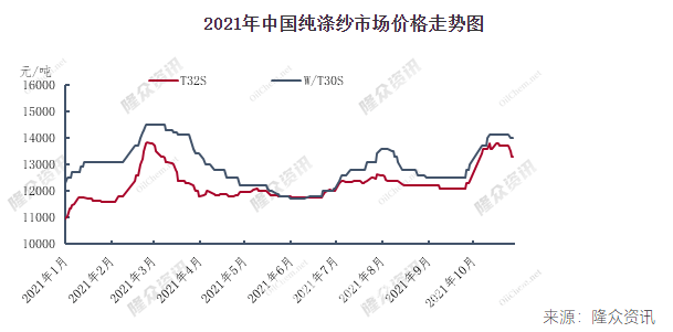 市場價(jià)格跌宕起伏,年初受成本上漲以及部分海外訂單回流至國內(nèi)影響,市場價(jià)格強(qiáng)勢上漲;但3月份以后,受海外疫情肆虐以及集裝箱不足、海運(yùn)費(fèi)高企等因素影響,終端訂單持續(xù)偏弱,滌紗市場需求平淡,疊加原材料下滑等因素拖累,市場價(jià)格總體呈現(xiàn)弱勢下滑局面。6月份之后,雖處于常規(guī)淡季,但擔(dān)憂海航運(yùn)問題部分外貿(mào)訂單有所提前,疊加原材料滌綸短纖價(jià)格在供應(yīng)端集中減產(chǎn)下價(jià)格逐漸止跌影響,純滌紗市場也呈現(xiàn)盤整階段。9月中下旬以來,受各地雙控政策影響的限產(chǎn)影響,原材料價(jià)格高企,且紗廠自身供應(yīng)緊張,市場價(jià)格總體漲勢明顯。2021年1-10月,長樂T32S年均價(jià)12273元/噸,同比上升19.96%。11月至今,則受原料下跌以及后續(xù)訂單到位不足的拖累價(jià)格出現(xiàn)一定下滑。