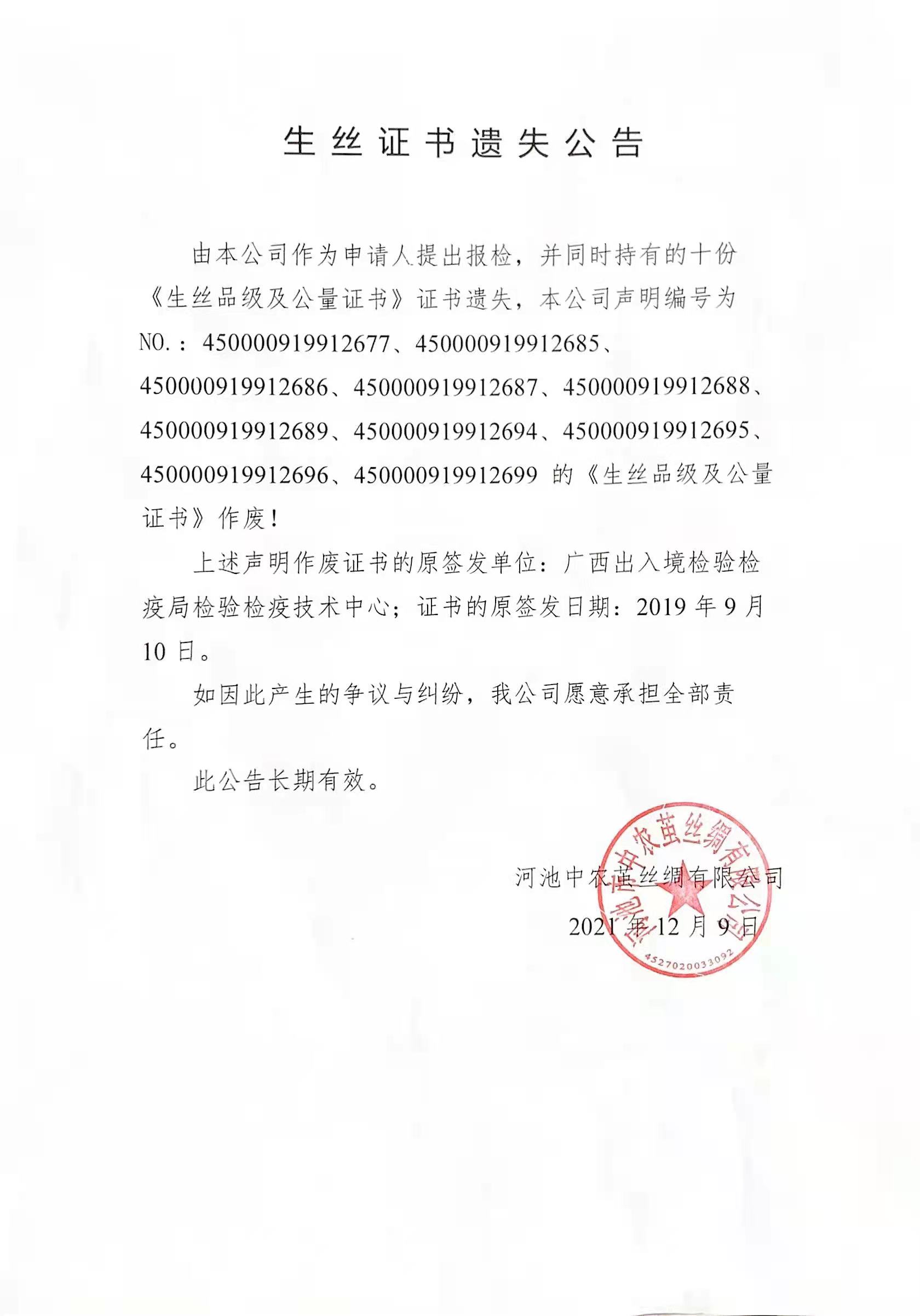 企業(yè)生絲證書遺失聲明