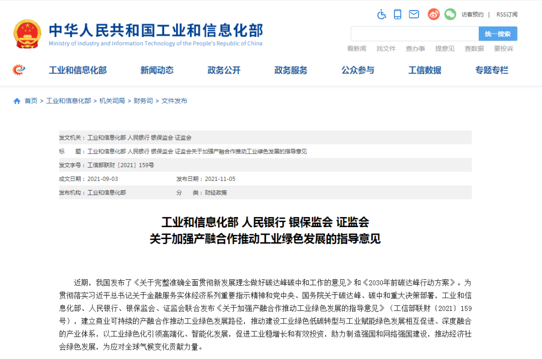 為貫徹落實習(xí)近平總書記關(guān)于金融服務(wù)實體經(jīng)濟(jì)系列重要指示精神和黨中央、國務(wù)院關(guān)于碳達(dá)峰、碳中和重大決策部署,工業(yè)和信息化部、人民銀行、銀保監(jiān)會、證監(jiān)會聯(lián)合發(fā)布《關(guān)于加強(qiáng)產(chǎn)融合作推動工業(yè)綠色發(fā)展的指導(dǎo)意見》(工信部聯(lián)財〔2021〕159號),建立商業(yè)可持續(xù)的產(chǎn)融合作推動工業(yè)綠色發(fā)展路徑,推動建設(shè)工業(yè)綠色低碳轉(zhuǎn)型與工業(yè)賦能綠色發(fā)展相互促進(jìn)、深度融合的產(chǎn)業(yè)體系,以工業(yè)綠色化引領(lǐng)高端化、智能化發(fā)展,促進(jìn)工業(yè)穩(wěn)增長和有效投資,助力制造強(qiáng)國和網(wǎng)絡(luò)強(qiáng)國建設(shè),推動經(jīng)濟(jì)社會綠色發(fā)展,為應(yīng)對全球氣候變化貢獻(xiàn)力量。