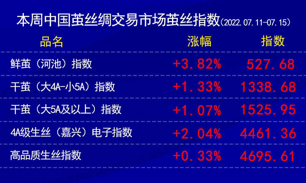 本周市場各繭絲指數(shù)均以紅盤報收,漲幅有所不一。