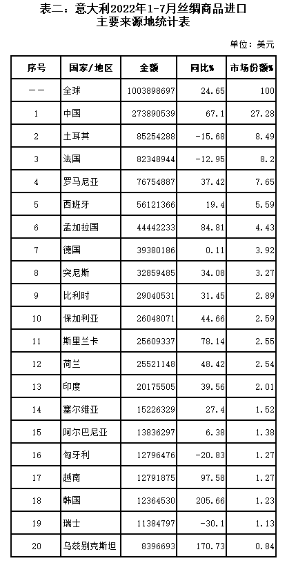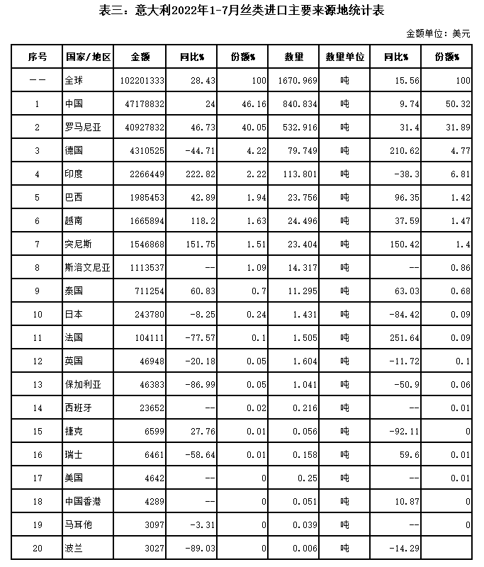 表三:意大利2022年1-7月絲類進(jìn)口主要來源地統(tǒng)計(jì)表
