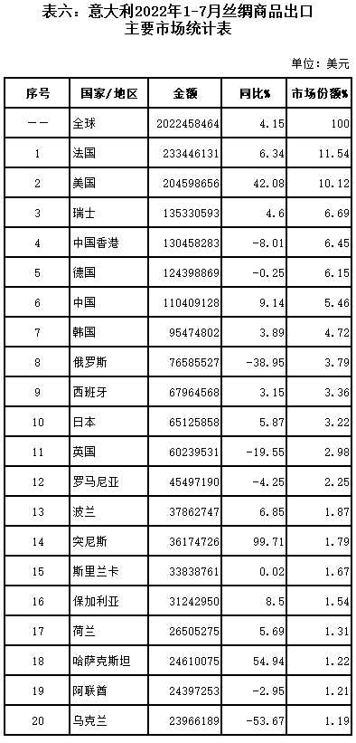 表六:意大利2022年1-7月絲綢商品出口主要市場(chǎng)統(tǒng)計(jì)表
