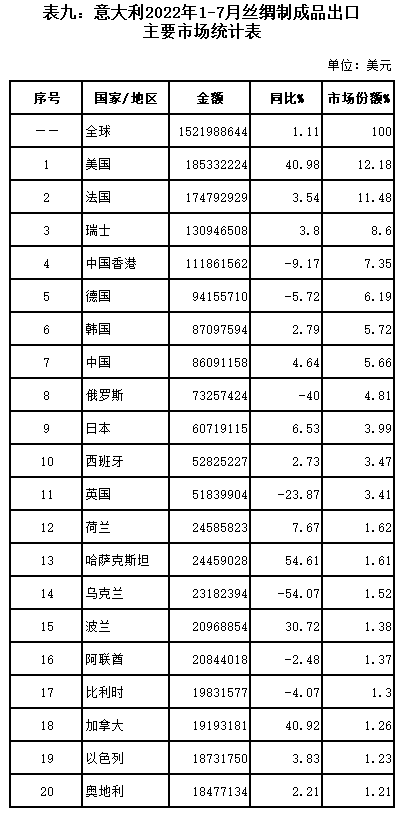 表九:意大利2022年1-7月絲綢制成品出口主要市場(chǎng)統(tǒng)計(jì)表