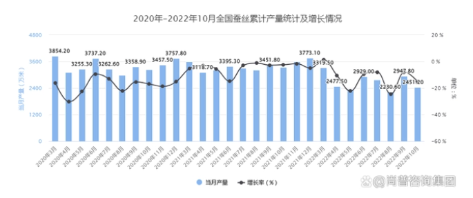 2022年10月全國蠶絲當(dāng)月產(chǎn)量接近2500萬米