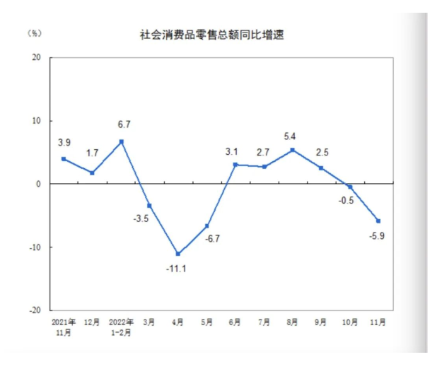 國(guó)家統(tǒng)計(jì)局今日最新發(fā)布的月度數(shù)據(jù)顯示,受疫情短期沖擊加大影響,11月份工業(yè)、投資、消費(fèi)等數(shù)據(jù)有所回落。11月份社會(huì)消費(fèi)品零售總額同比下降5.9%,此前市場(chǎng)預(yù)期11月的消費(fèi)增長(zhǎng)是-3.7%,但中西藥品類商品零售額同比增長(zhǎng)8.3%。
