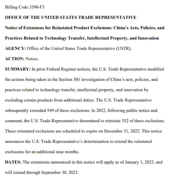 2021年10月,USTR宣布擬重新豁免549項(xiàng)中國(guó)進(jìn)口商品的加征關(guān)稅,并就此征詢公眾意見。2022年3月,USTR宣布對(duì)這549項(xiàng)待定產(chǎn)品中的352項(xiàng)中國(guó)產(chǎn)品豁免加征關(guān)稅。該規(guī)定適用于2021年10月12日至2022年12月31日之間進(jìn)口自中國(guó)的商品。