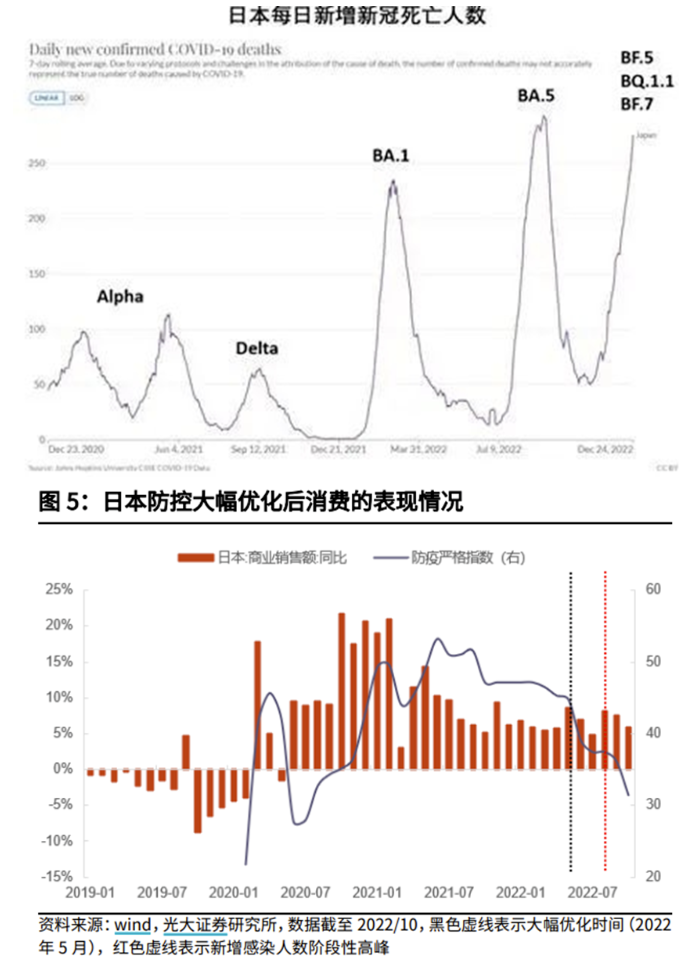 拿日本的數(shù)據(jù)來說,日本在放開后如今已經(jīng)在面臨第8次波峰了,但是消費(fèi)數(shù)據(jù)并沒有伴隨疫情波峰出現(xiàn)明顯震蕩。反而可以看到疫情波峰的到來,背后原因恰恰是人們出門更多導(dǎo)致的,因此消費(fèi)的波峰反而與疫情波峰同步。