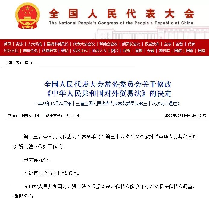 2022年12月30日發(fā)布的全國人民代表大會(huì)常務(wù)委員會(huì)關(guān)于修改《中華人民共和國對外貿(mào)易法》的決定稱,第十三屆全國人民代表大會(huì)常務(wù)委員會(huì)第三十八次會(huì)議決定對《中華人民共和國對外貿(mào)易法》作出“刪去第九條”的修改。本決定自公布之日起施行。