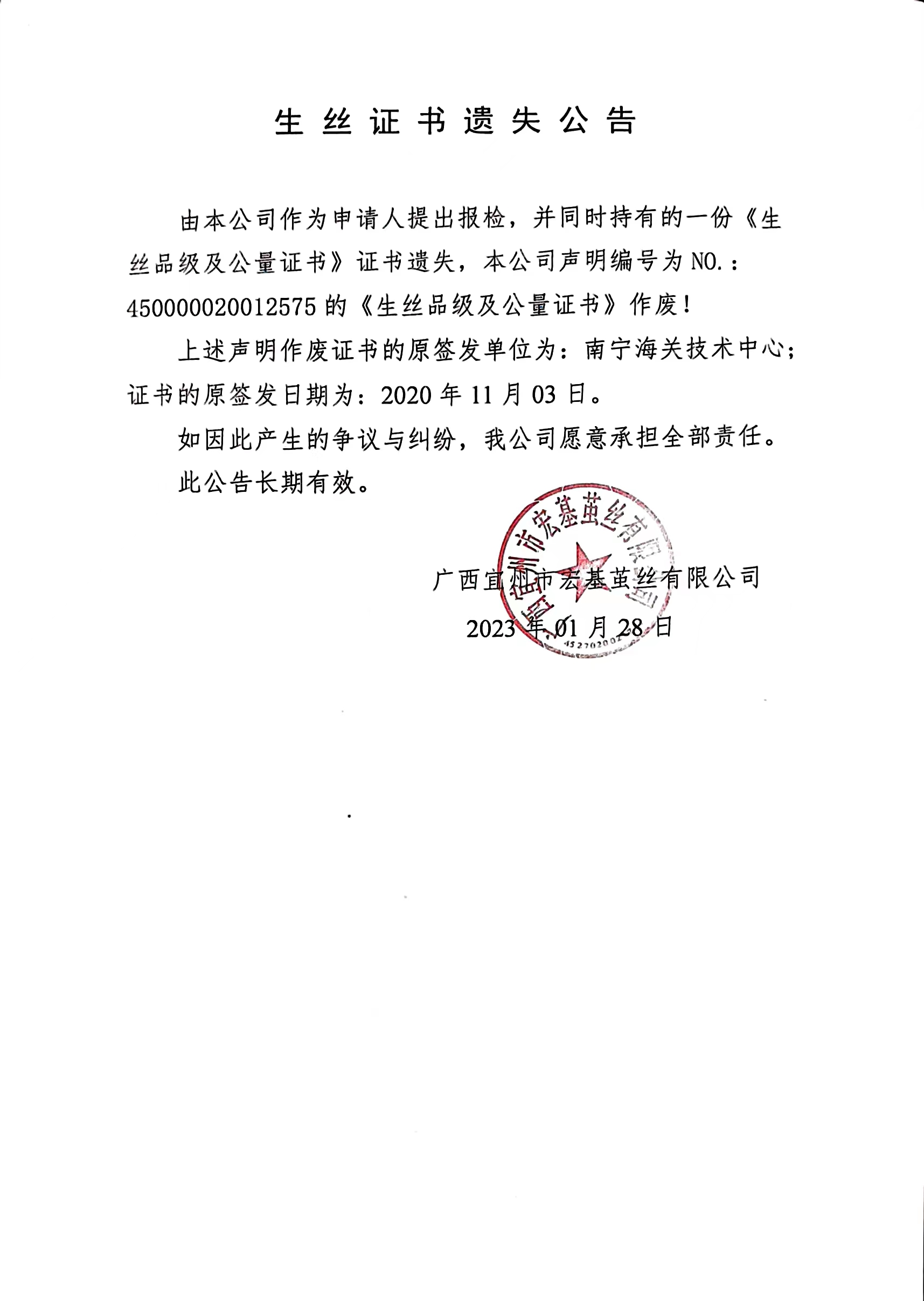 企業(yè)生絲證書(shū)遺失聲明(20230128)
