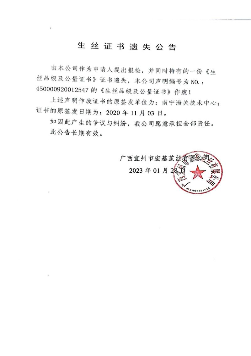 企業(yè)生絲證書遺失聲明(20230128)