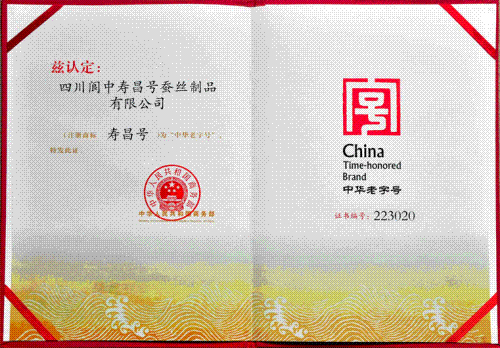 四川閬中壽昌號(hào)蠶絲制品有限公司是2004年初,經(jīng)閬中市工商行政管理局批準(zhǔn)注冊(cè)的股份制有限公司,其經(jīng)營范圍為蠶絲制品加工、銷售、對(duì)外貿(mào)易。產(chǎn)品注冊(cè)商標(biāo)為“壽昌號(hào)”,公司地址仍在原壽昌號(hào)發(fā)跡店址?!皦鄄?hào)”是由現(xiàn)公司董事長陳小鋒外祖父方長生,字壽昌(祖籍浙江紹興人)于1887年創(chuàng)立。