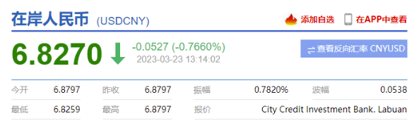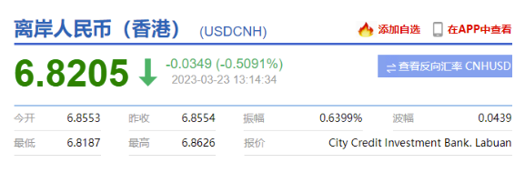 3月23日,人民幣對美元即期匯率開盤即大漲近400點(diǎn),隨后繼續(xù)升破6.85和6.83關(guān)口。