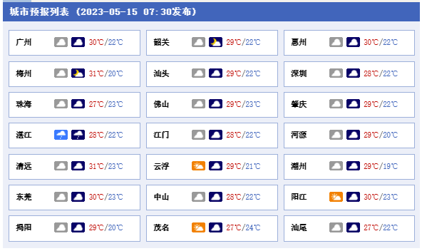 城市方面,廣州15日,多云間陰天,局部陣雨,21℃~28℃;16日,多云到陰天,有(雷)陣雨,22℃~28℃;17日,多云到陰天,有雷陣雨,22℃~28℃。