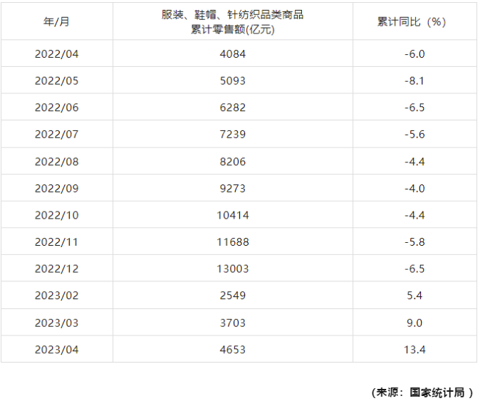 下圖為自2022年4月至2023年4月我國服裝、鞋帽、針紡織品類商品零售額。