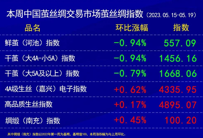 今日(2023年05月19日,周五)中國繭絲綢交易市場生絲指數(shù)微跌0.02%收于4335.95點(diǎn),本周生絲指數(shù)上漲0.62%。B絲(商檢4A級生絲):230525合約下跌0.06萬元報(bào)收于43.17萬元;230925合約報(bào)平收于43.38萬元;240325合約下跌0.03萬元報(bào)收于43.44萬元。