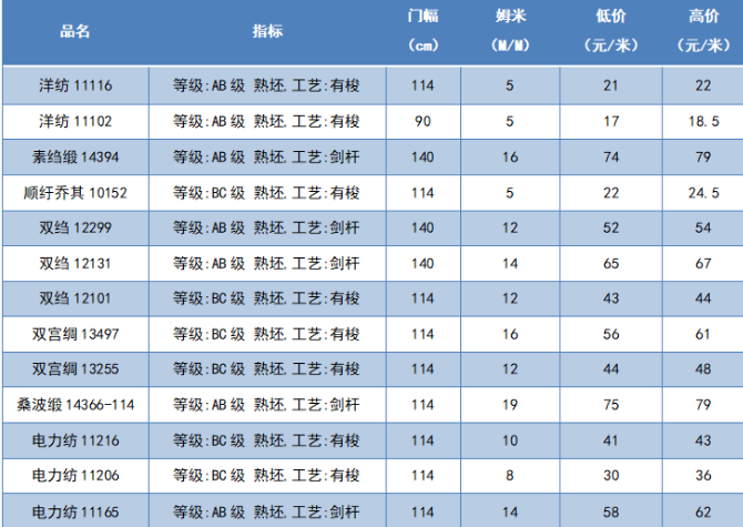 本周綢緞指數(shù)協(xié)作單位成交價(jià)格區(qū)間