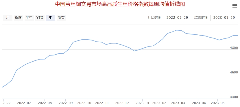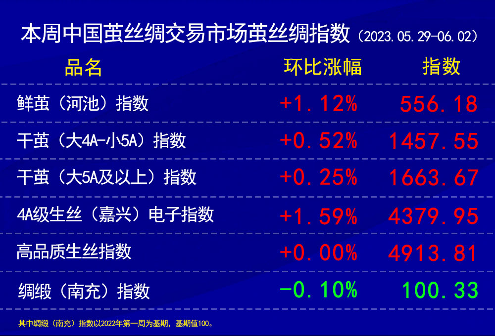 今日(2023年06月02日,周五)中國繭絲綢交易市場生絲指數(shù)上漲0.54%收于4379.95點,本周生絲指數(shù)上漲1.59%。B絲(商檢4A級生絲):230625合約上漲0.24萬元報收于43.59萬元;230925合約上漲0.27萬元報收于43.95萬元;240325合約上漲0.45萬元報收于44.55萬元。