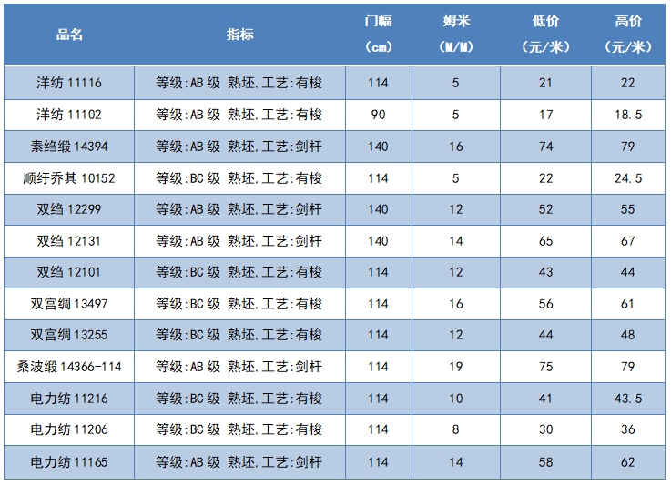 本周綢緞指數(shù)協(xié)作單位成交價格區(qū)間