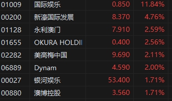 博彩股逆勢上漲,國際娛樂(0.85, 0.00, 0.00%)漲11.8%,新濠國際發(fā)展(8.15, -0.22, -2.63%)漲4.7%,美高梅中國(9.52, -0.17, -1.75%)、永利澳門(7.81, -0.10, -1.26%)、銀河娛樂(52.75, -0.65, -1.22%)均跟漲。消息方面,澳門特別行政區(qū)19日公布,今年5月入境旅客共2213807人次,同比增加2.7倍。旅客平均逗留時間為1.2日,同比上升0.3日。同時澳門特別行政區(qū)也公布,今年5月博彩毛收入為155.65億澳門元,環(huán)比增5.7%。前五個月,博彩毛收入649.29億澳門元,同比增172.9%。